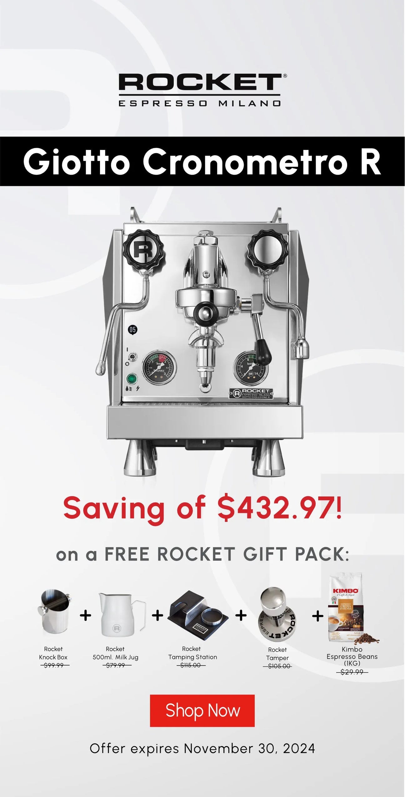 Purchase the Rocket Giotto Cronometro R and receive a FREE Rocket Barista Bundle worth over $430! This exclusive offer includes: