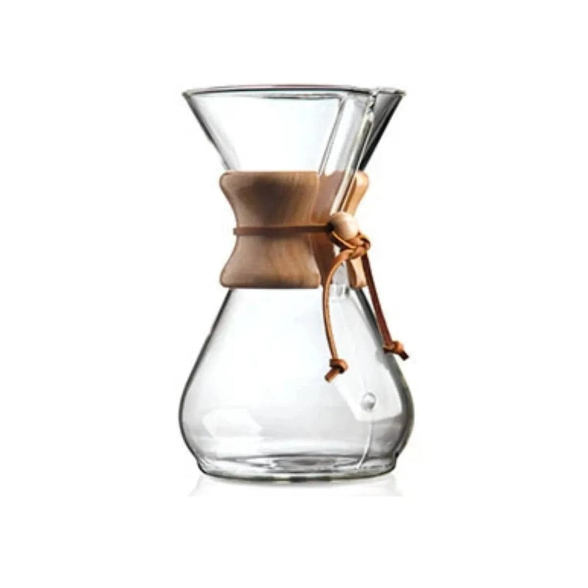The Chemex Classic pour-over coffee maker is the ultimate solution for coffee connoisseurs who can appreciate the flavourful taste that this specialty coffee maker produces. The Chemex Classic uses a patented non-porous glass designed specifically to maintain the purity of your coffee and eliminate any bitterness or sediment found in other coffee makers. Because of its purity, Chemex coffee can be refrigerated and reheated without losing any of its flavours! Includes a polished wood collar with a leather tie